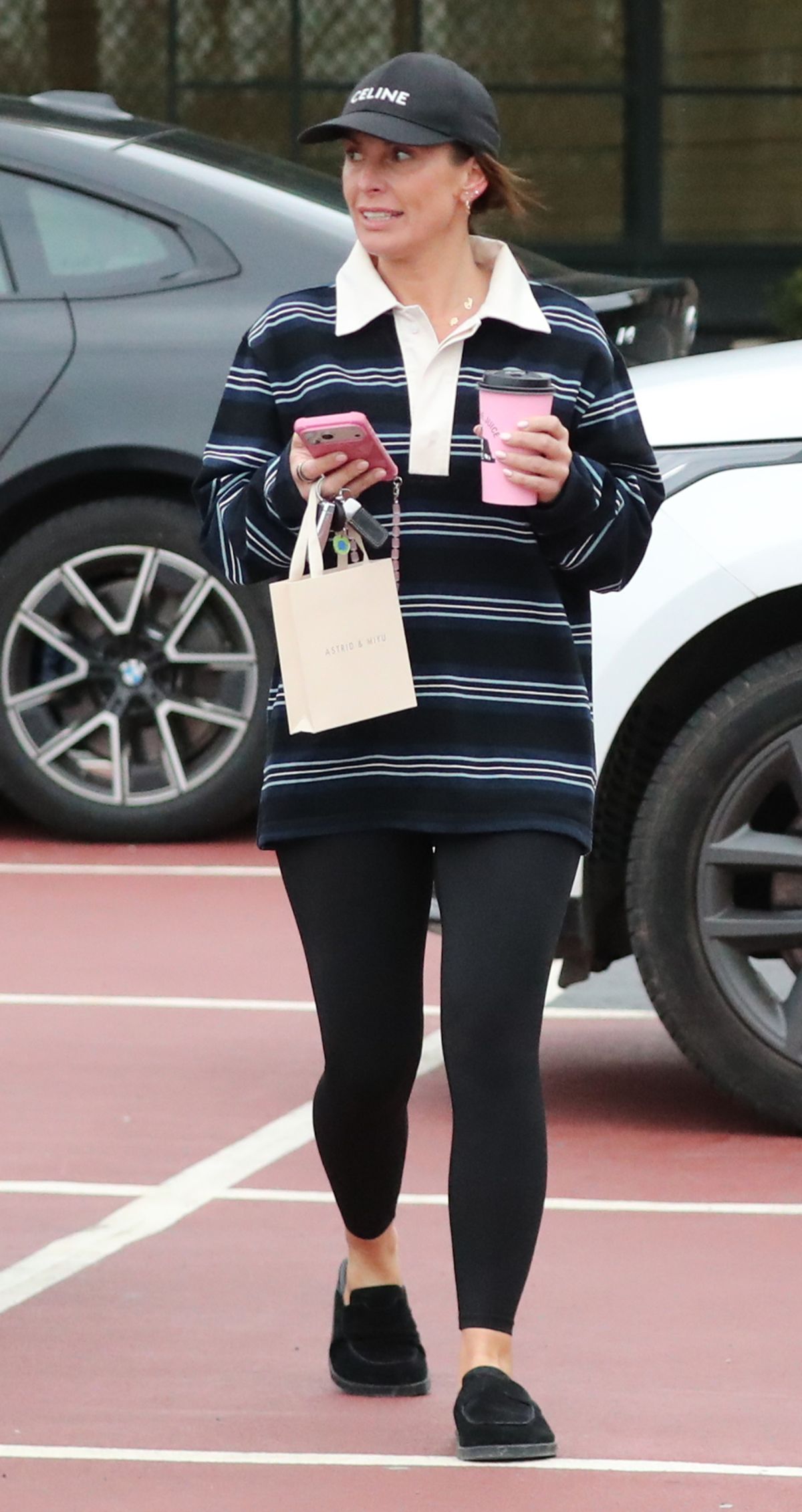 Coleen opted for a casual look for the occasion, which consisted of a striped top and leggings. She completed the look by sweeping her brown locks up into a baseball cap.