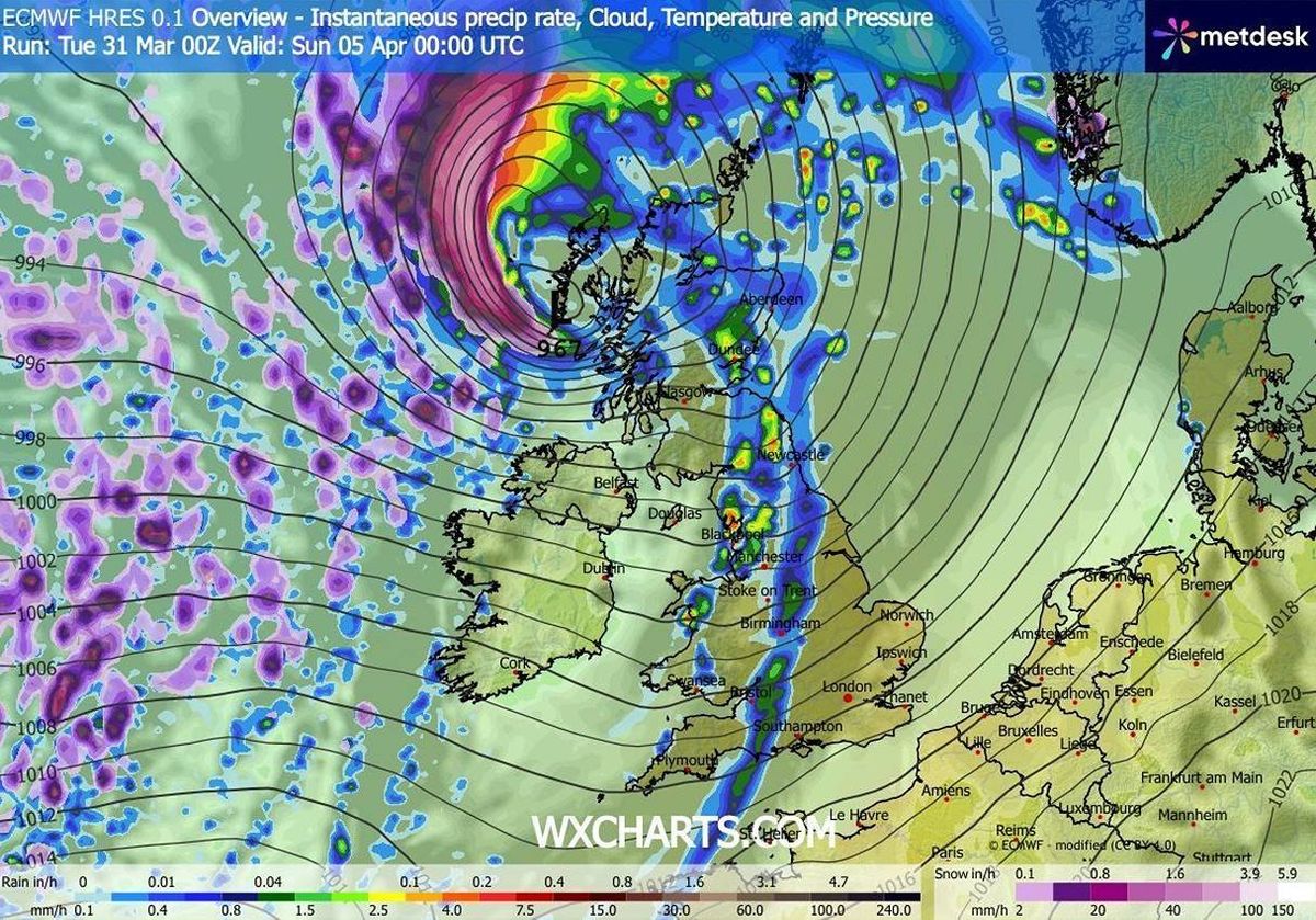 New weather maps from WXcharts, which were generated on March 31 using MetDesk data, show a wall of rain is set to arrive in the late hours of Saturday, April 4. The vicious system is expected to pour out inches of rain over several hours, arriving ahead of some mid-spring snowfall as the country tries to escape the lingering effects of winter.