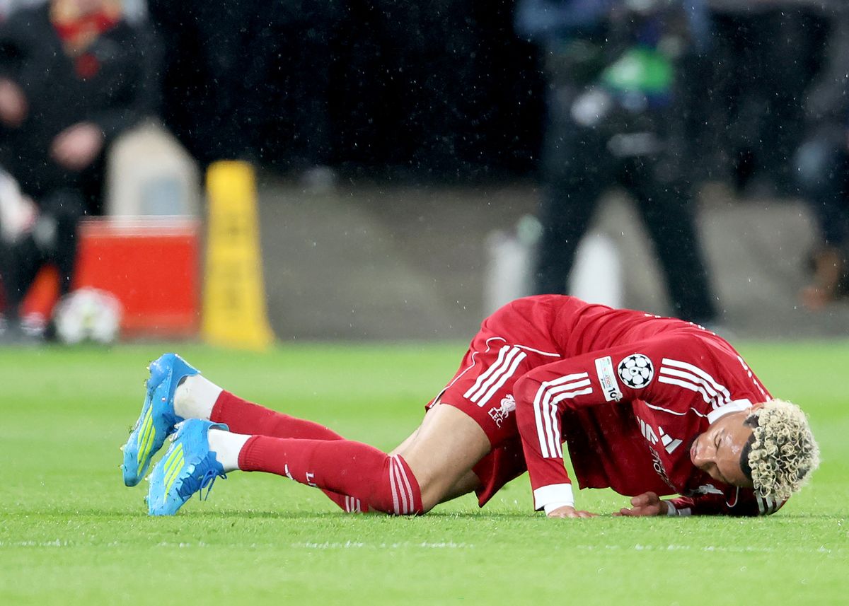 Hugo Ekitike of Liverpool is injured during the UEFA Champions League 2025/26 Quarter-Final Second Leg match between Liverpool FC and Paris Saint-Germain FC at Anfield on April 14, 2026 in Liverpool, England