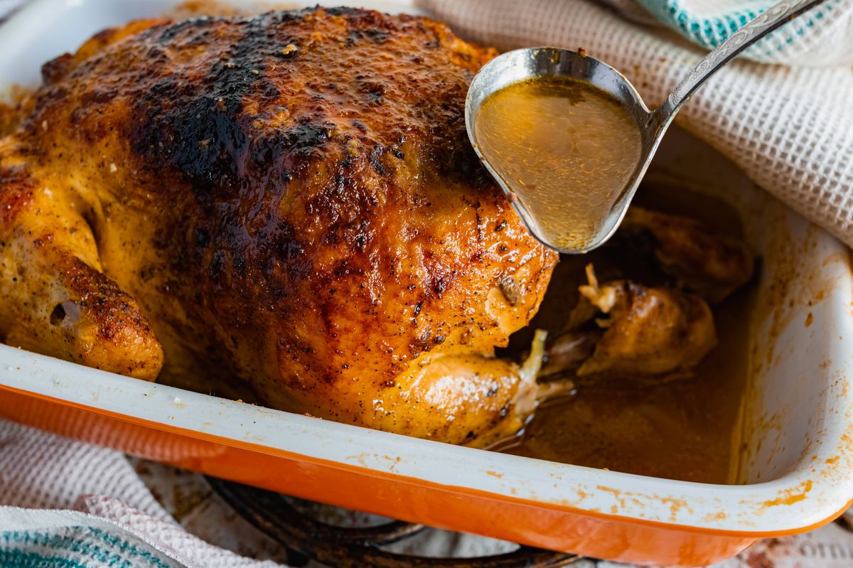 • Put your chicken in the oven to roast, and once an hour has passed, baste it every 15 minutes for the remainder of the cooking time with the butter and juices that have formed during cooking.