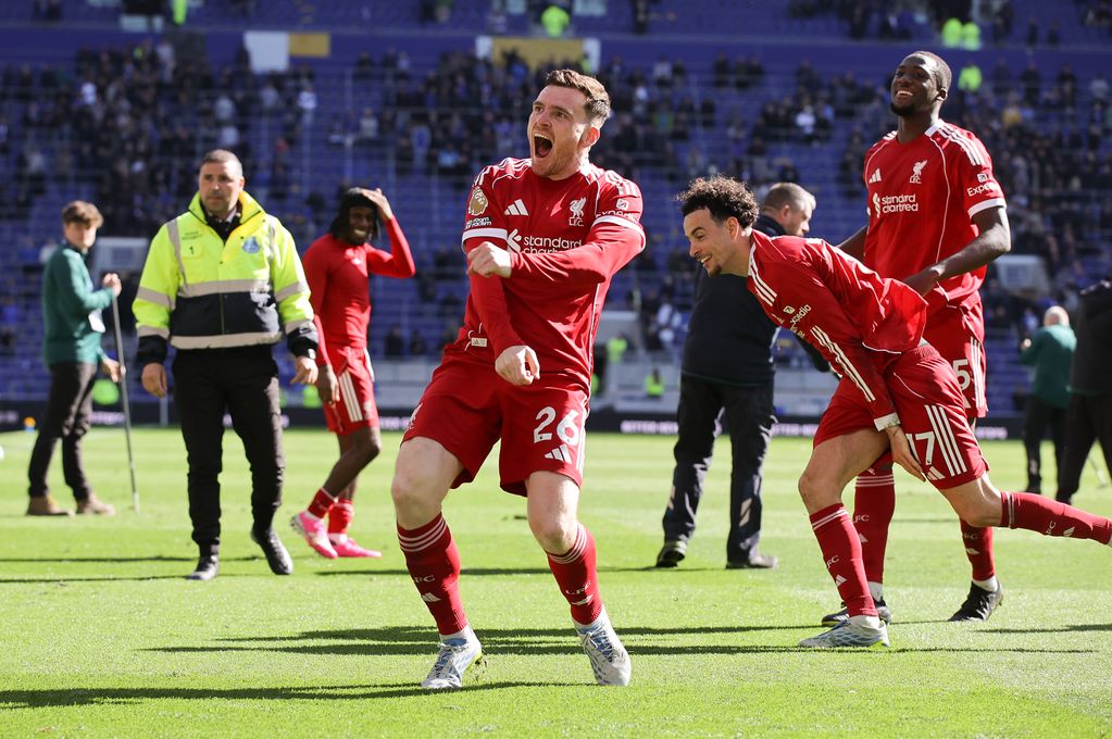 Andy Robertson leads the celebrations after Liverpool beat Everton at the Hill Dickinson Stadium.