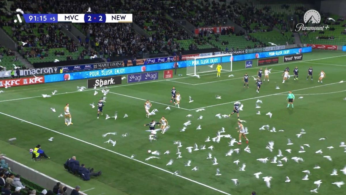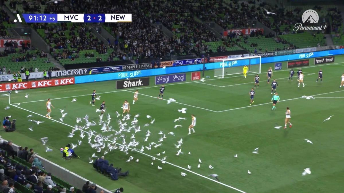 A flock of seagulls brought Melbourne Victory and Newcastle Jets’ A-League match to a standstill after descending onto the pitch during a free kick in the 90th minute at AAMI Park