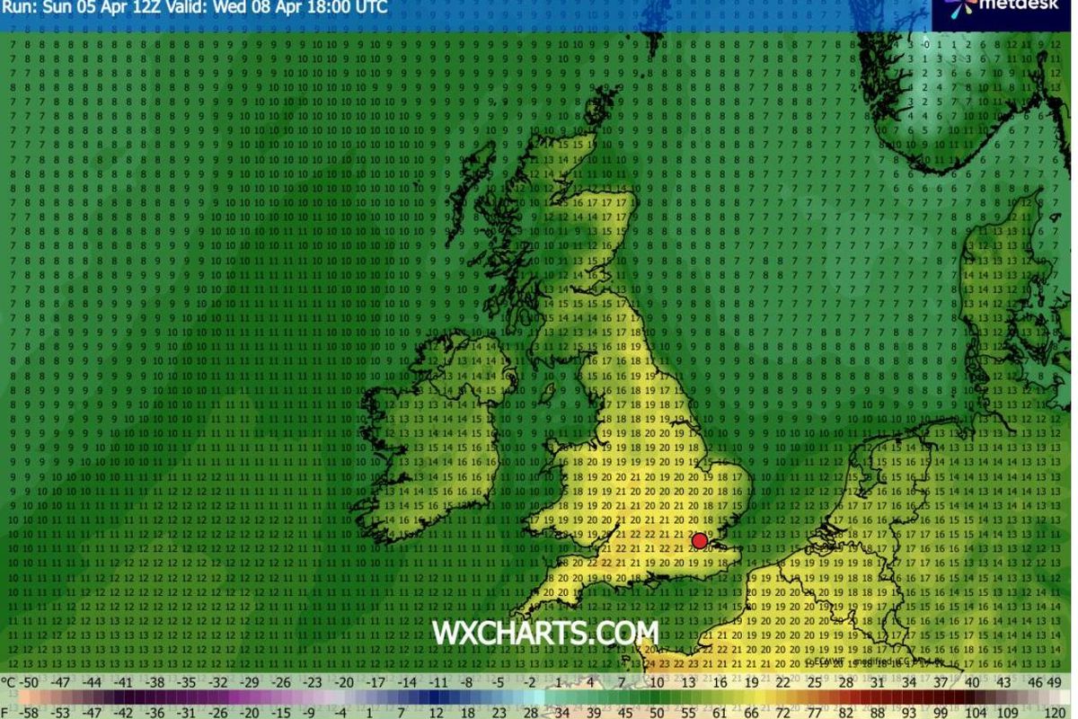 According to WXCharts weather maps, using MetDesk data, areas of the South East will reach 22C on Wednesday, April 8, while vast stretches of England will experience 21C.