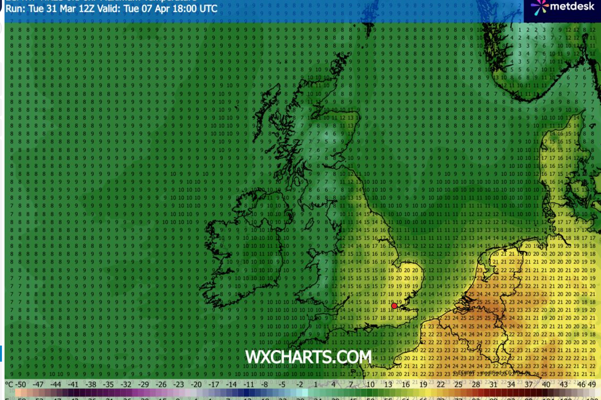 On Tuesday, April 7, parts of England are forecast highs of 20C, with the south soaking up most of the sun.