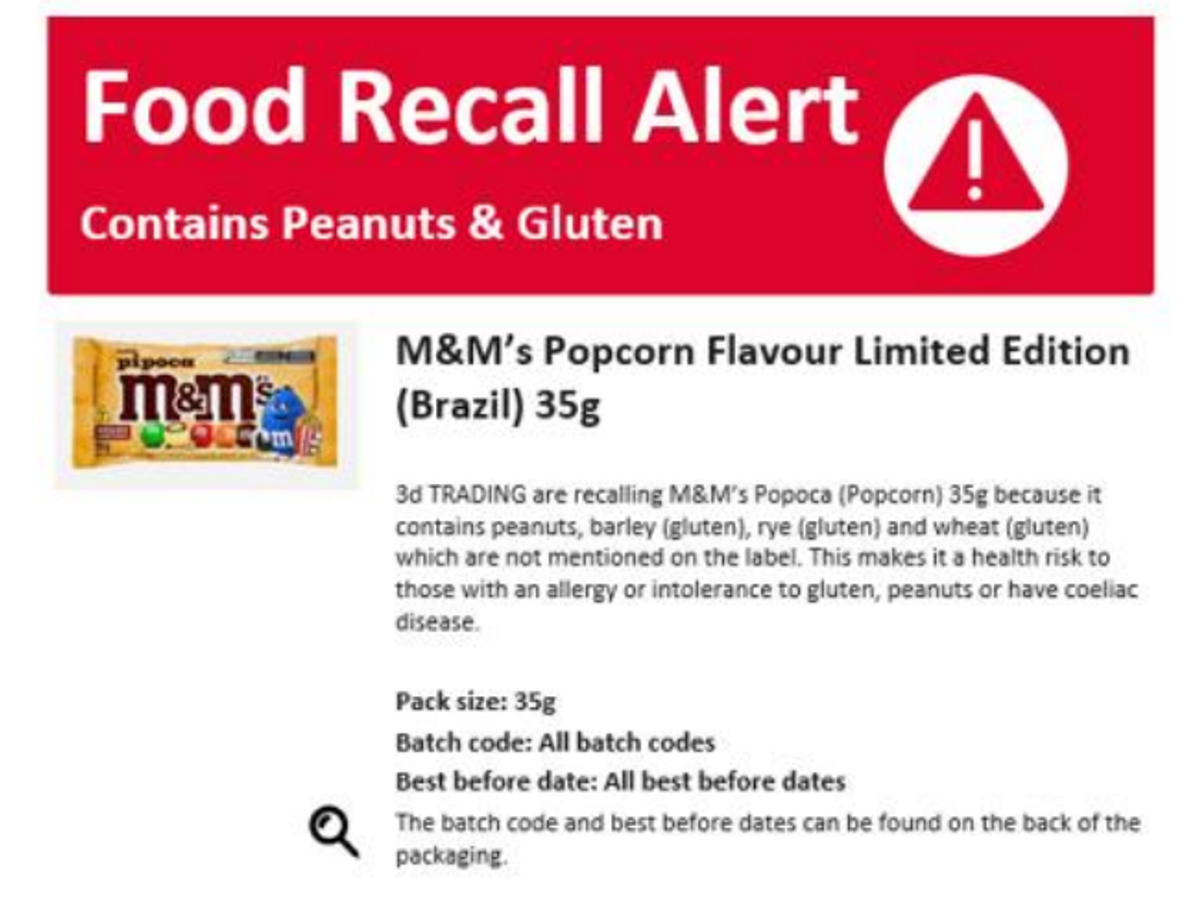 M&M’s Pipoca (popcorn) was recalled because it contains peanuts and gluten, and may contain barley, rye and wheat, which are not mentioned on the UK label.