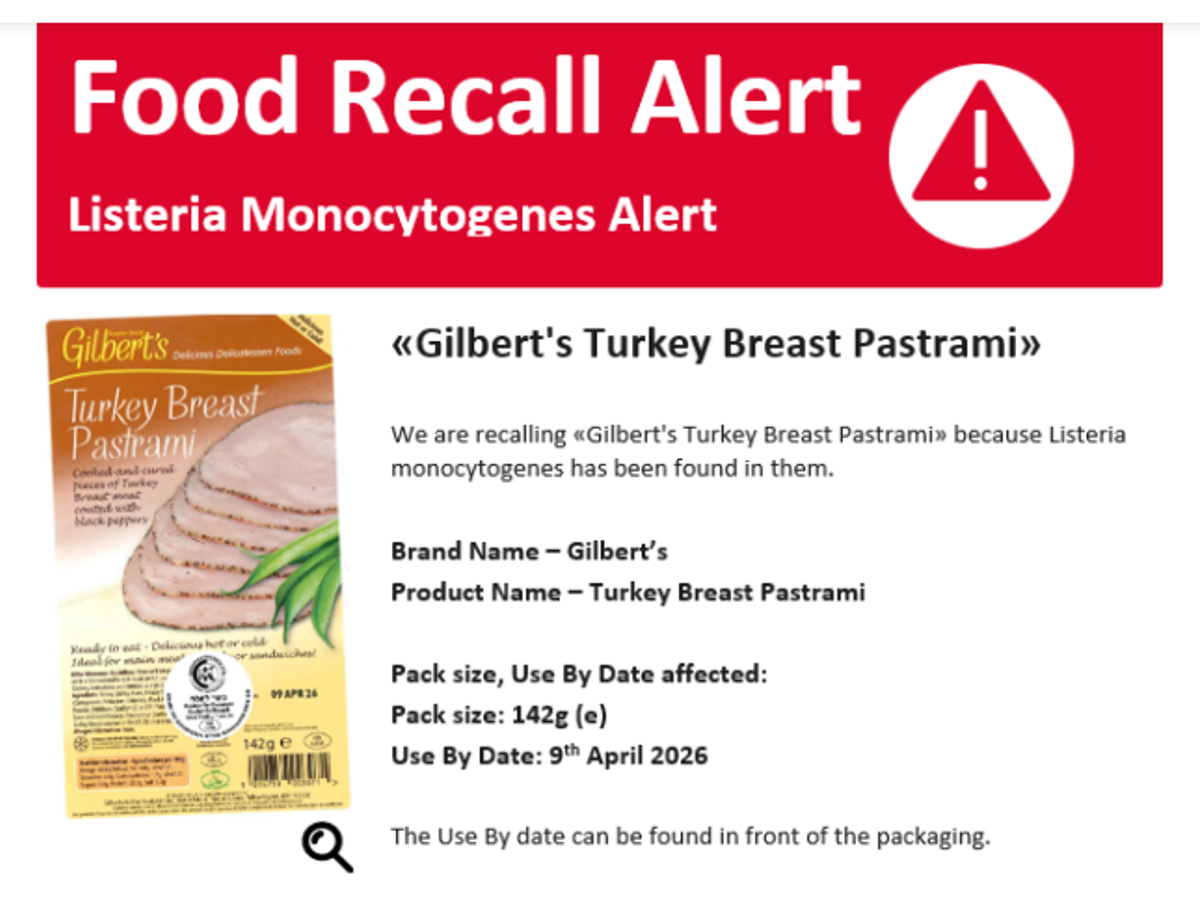 Gilbert’s 142g packs of Turkey Breast Pastrami have been recalled after Listeria monocytogenes was found in the product. The FSA said symptoms caused by listeria monocytogenes can be similar to flu.